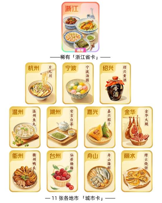 ·卡面有讲究:卡牌包含 1 张稀有「浙江省卡」和 11 张各地市「城市卡」,每张卡都印着家乡的特色美食,人情味满满!