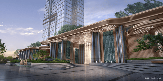 双大门设计打造超级滨江界面:主大门面阔约100米、高约14米;次大门面阔约80米、高约10M。中轴对称形制,打造超级滨江界面。