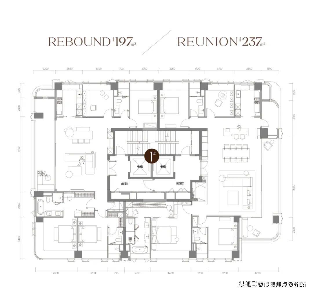 项目共由4栋21-46层高层住宅组成,其中首推的便是小高层的1栋1单元楼王,2梯2户设计,专梯入户,私密性强,南北通透,分别是197平和237平的纯4房户型。
