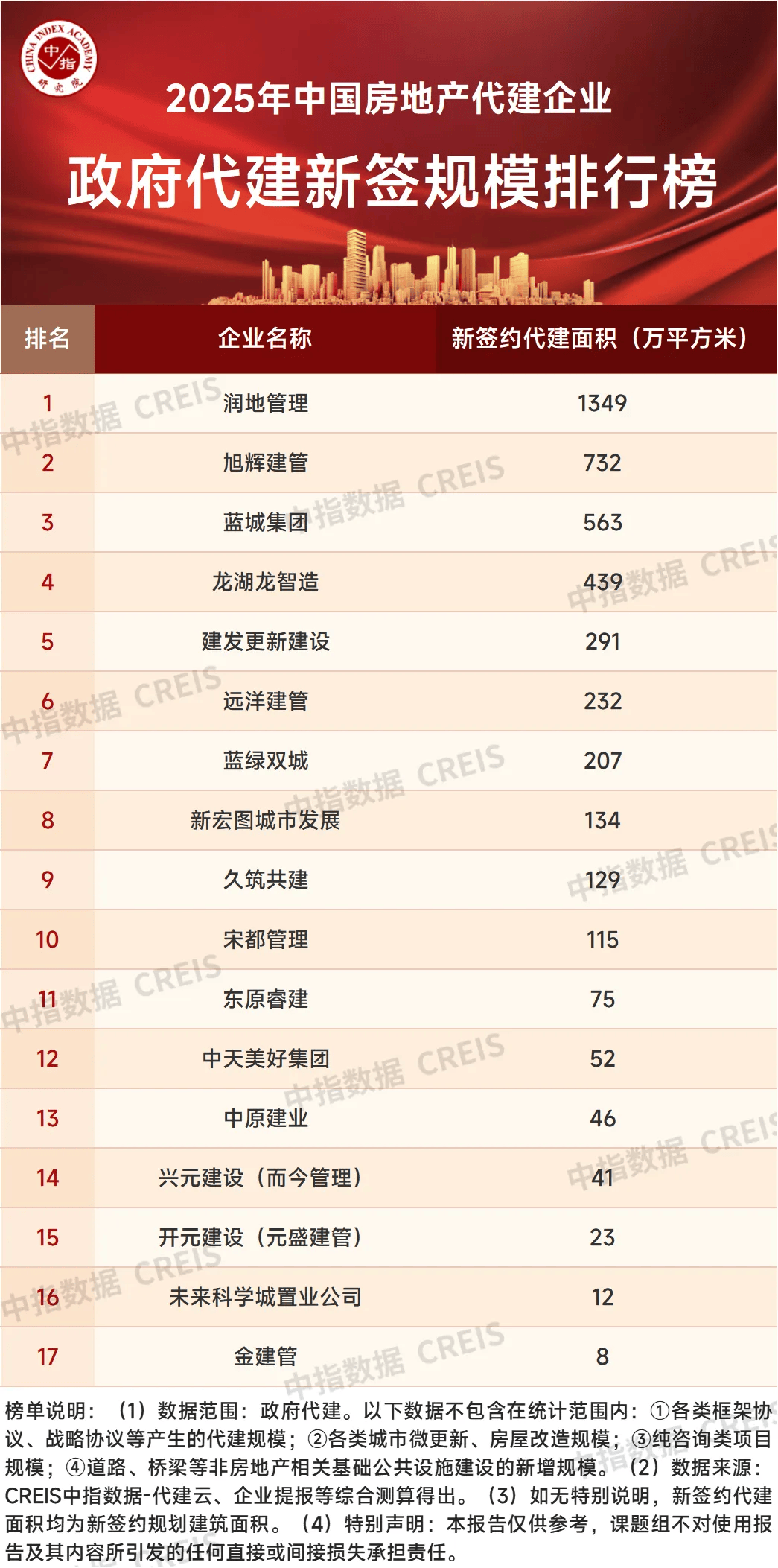 2025年,房地产代建企业积极布局政府代建,从榜单来看,润地管理以1349万平方米的新拓面积位列榜单第一。面对代建行业进入高质量发展阶段,润地管理凭借其“快好省规”的专业体系与政府大型重点项目的丰富实践,构建了核心竞争力,在“6+2”的全产品赛道积极开拓,赢得政企客户深度信任,2025年中标多个重大项目,行业领军地位持续保持。旭辉建管和蓝城集团位列二、三位,新签约政府代建规模分别为732万平方米和563万平方米。2025年,代建企业在政府代建方面主要以保障房、学校、体育场馆等为主,部分企业也在探索城市更新中的代建机遇。