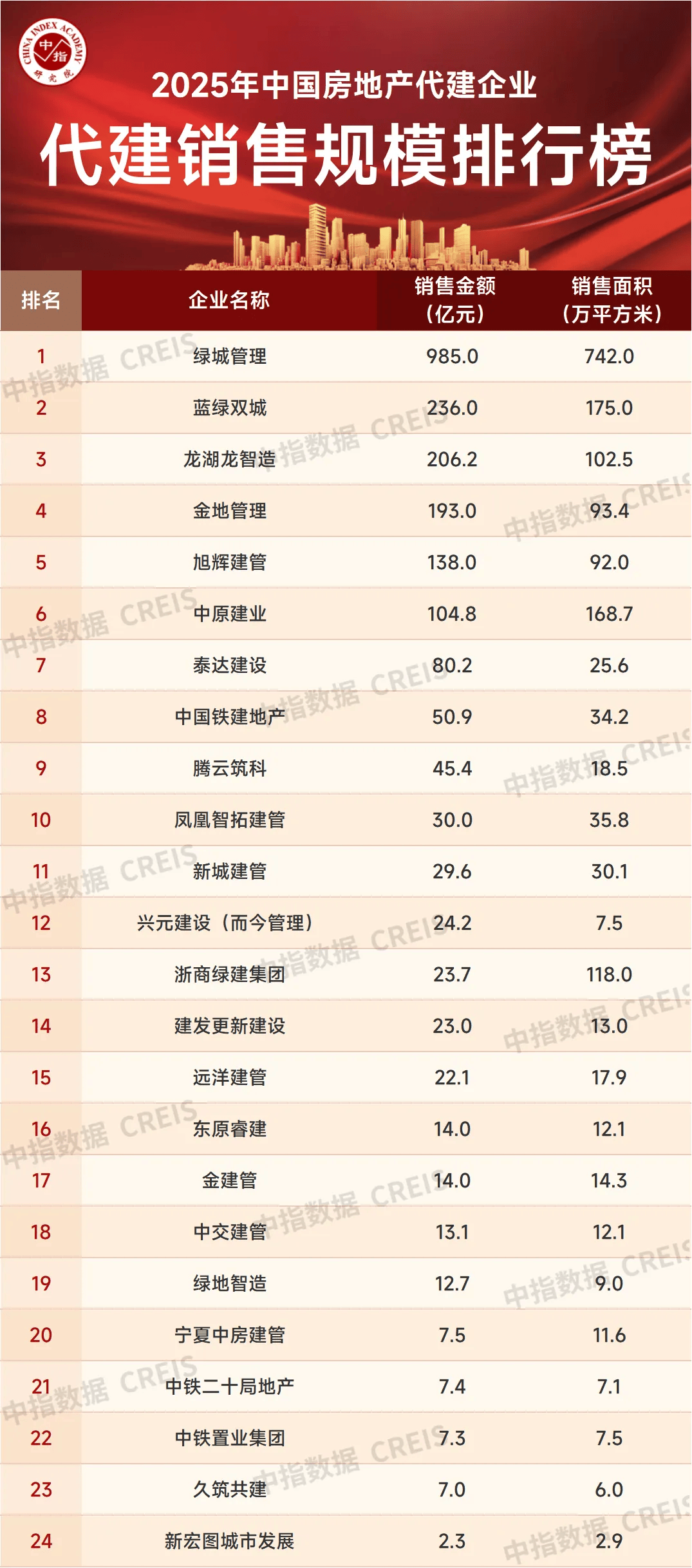 2025年,绿城管理以985亿元合约销售金额位列代建销售榜首位。蓝绿双城和龙湖龙智造代建项目销售金额分别为236亿元和206.2亿元,位列二、三位。随着入局代建企业增加,代建项目纷纷进入销售阶段,代建企业销售规模也在持续提升。